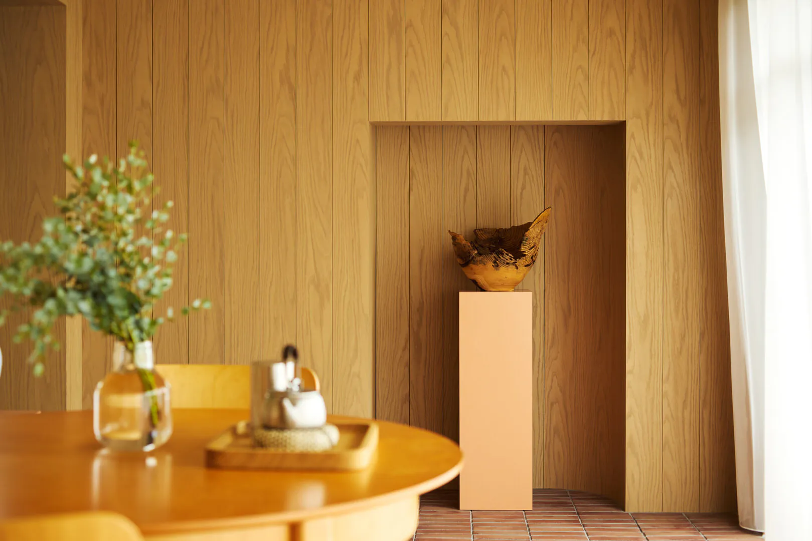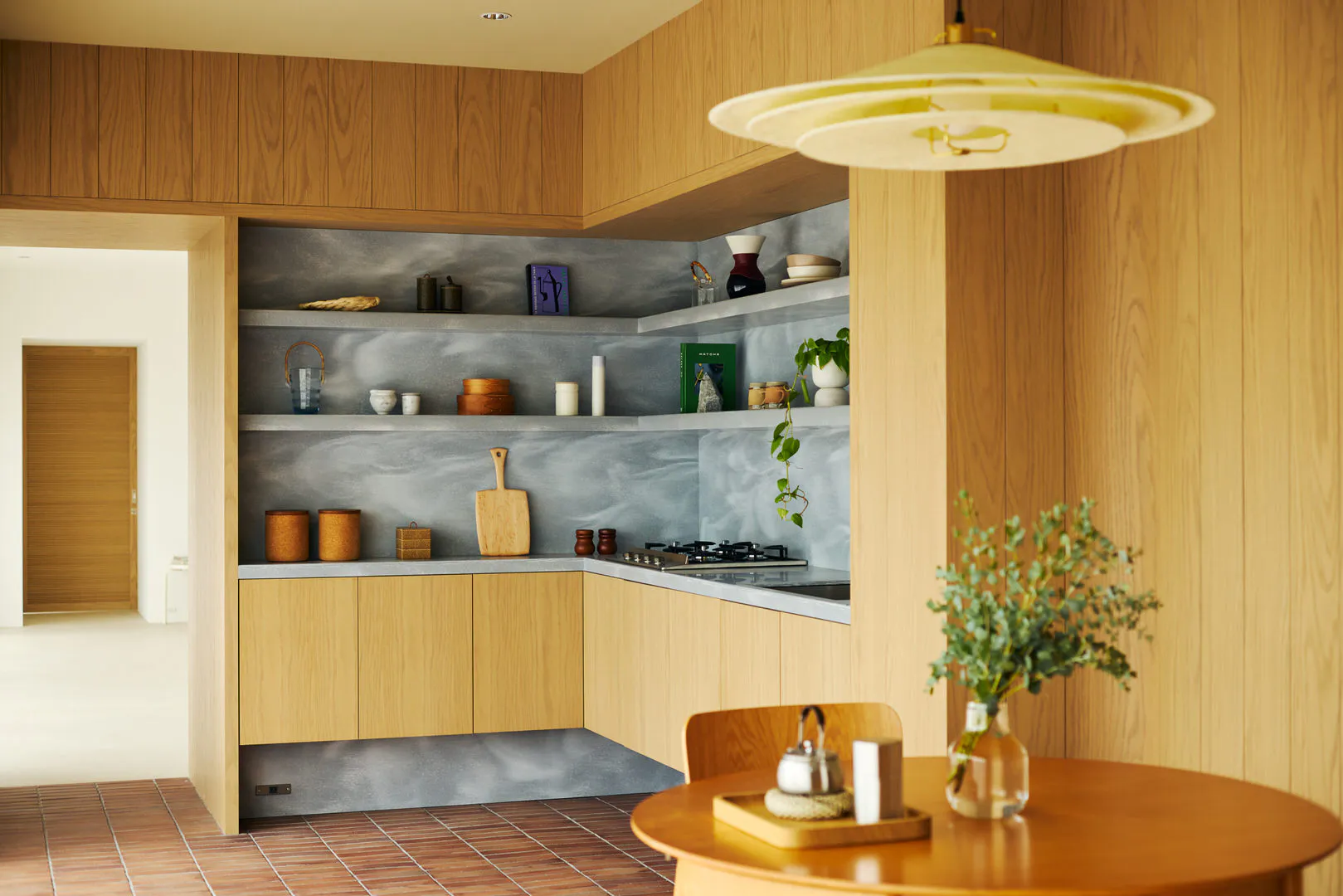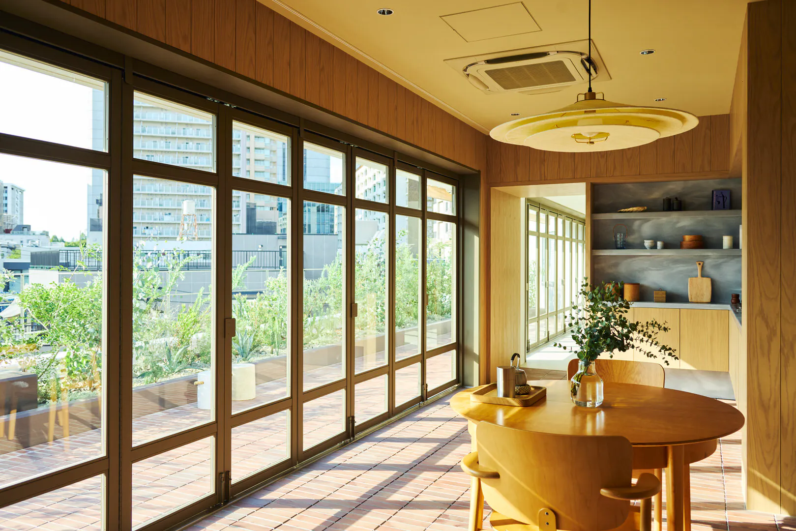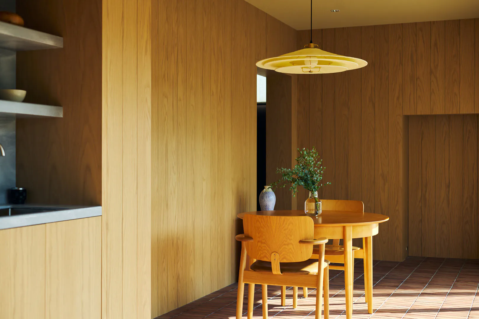 ダイニングキッチンは素材感を活かした設え。レンガの床は空間に温度と奥行きを与え、木質の壁はやさしい陰影を生み出します。