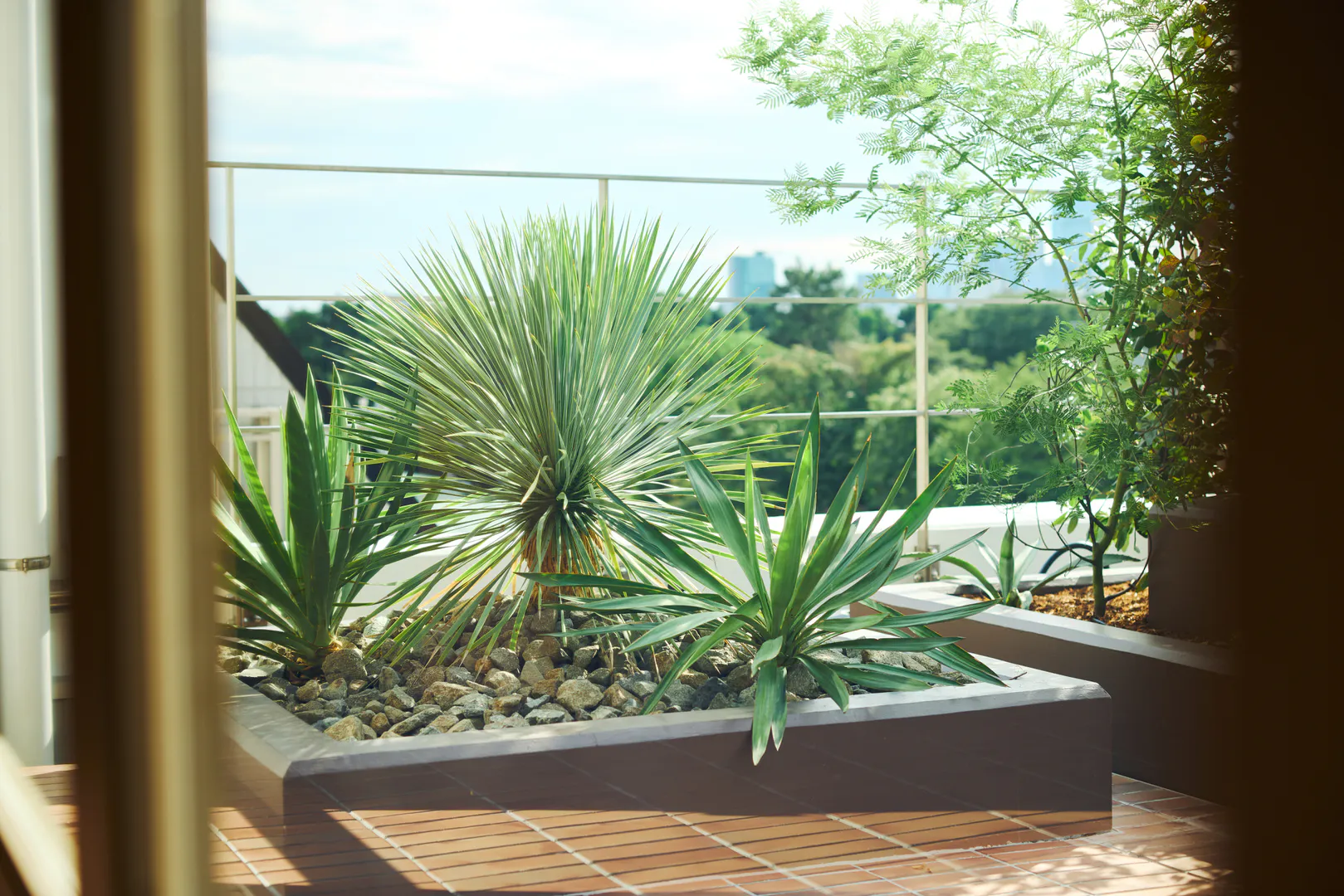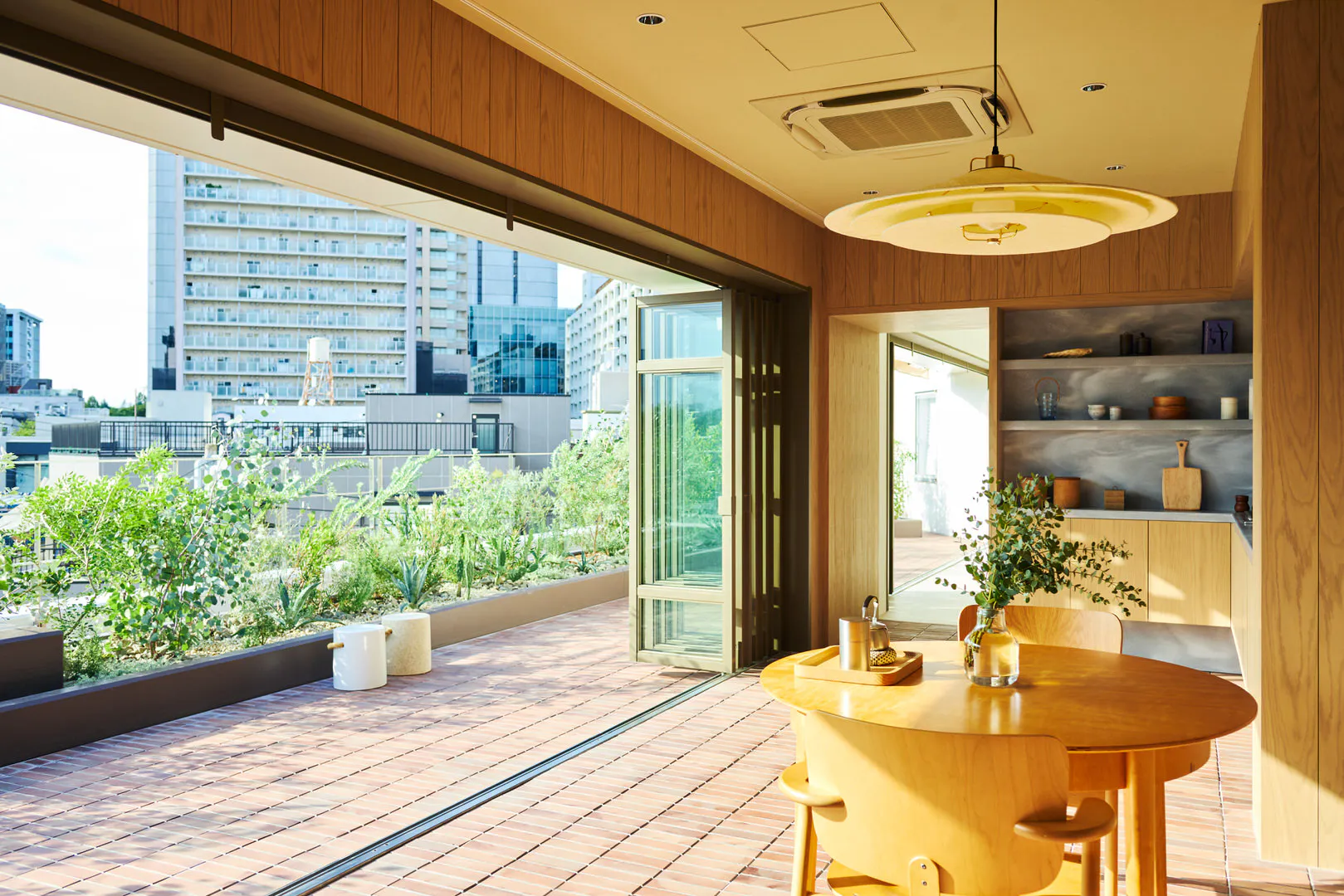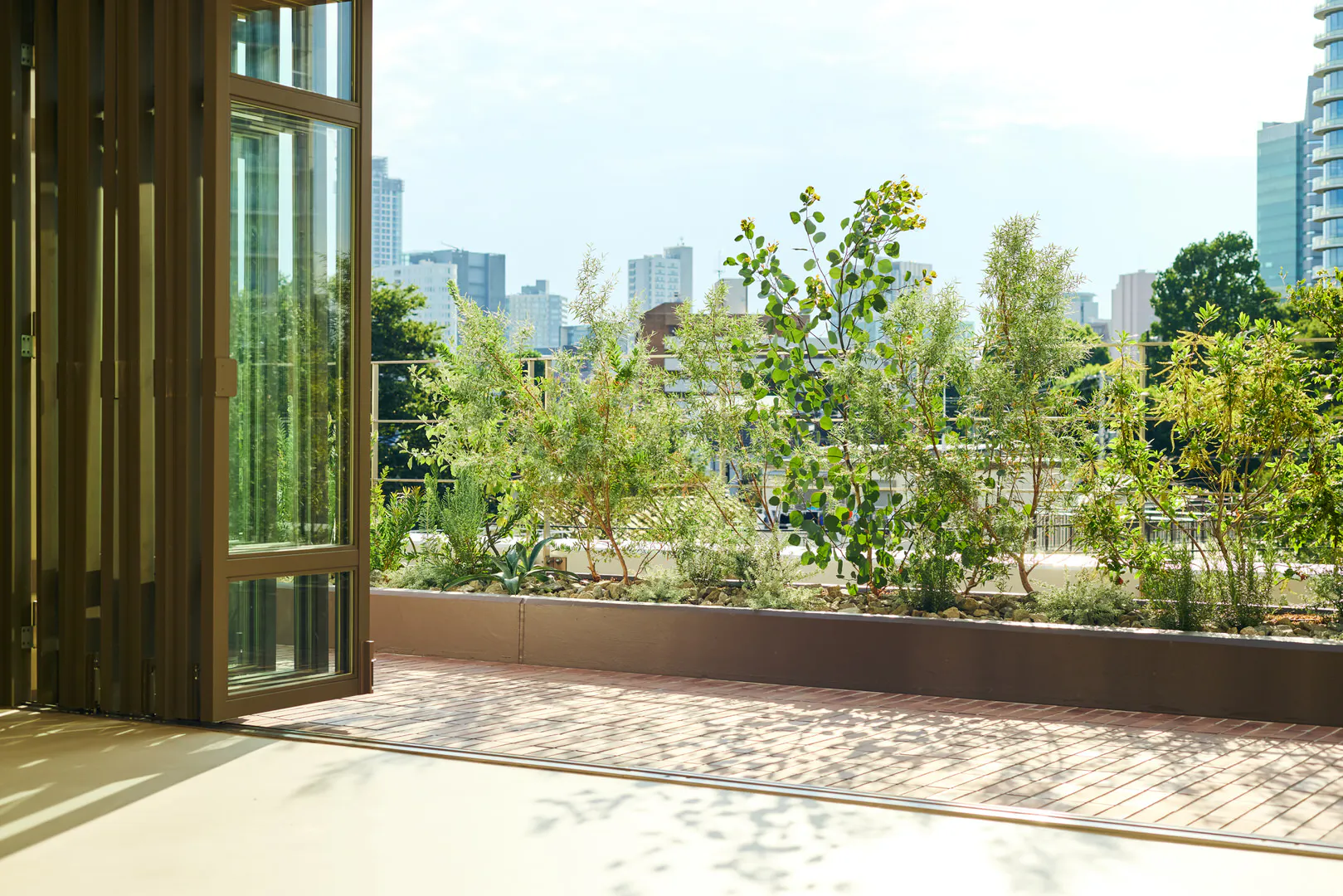 スタジオに入った瞬間に広がる緑豊かなルーフテラスは、空がひらけた開放的なビュー。遠景の街の緑とつながることで、背景に連続する奥行きを演出できます。