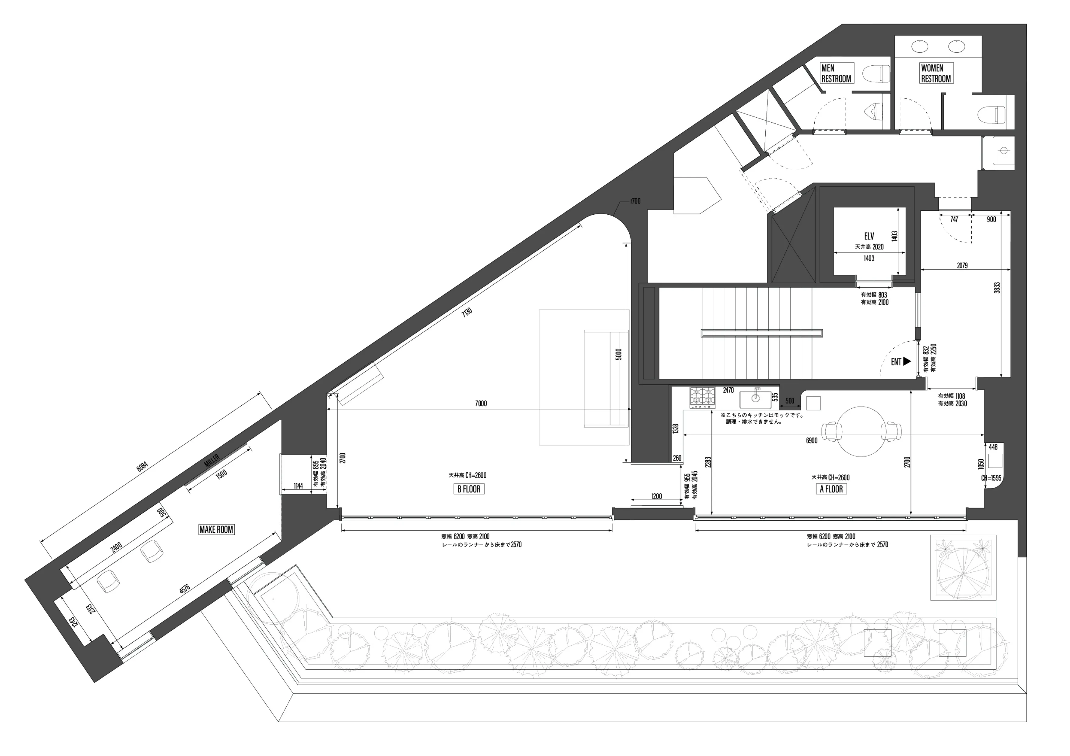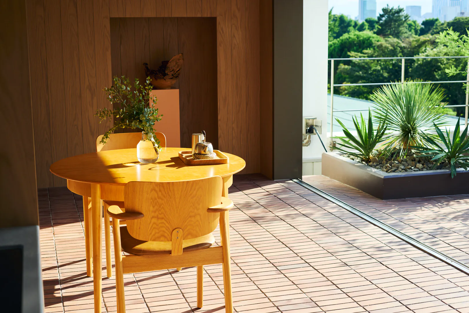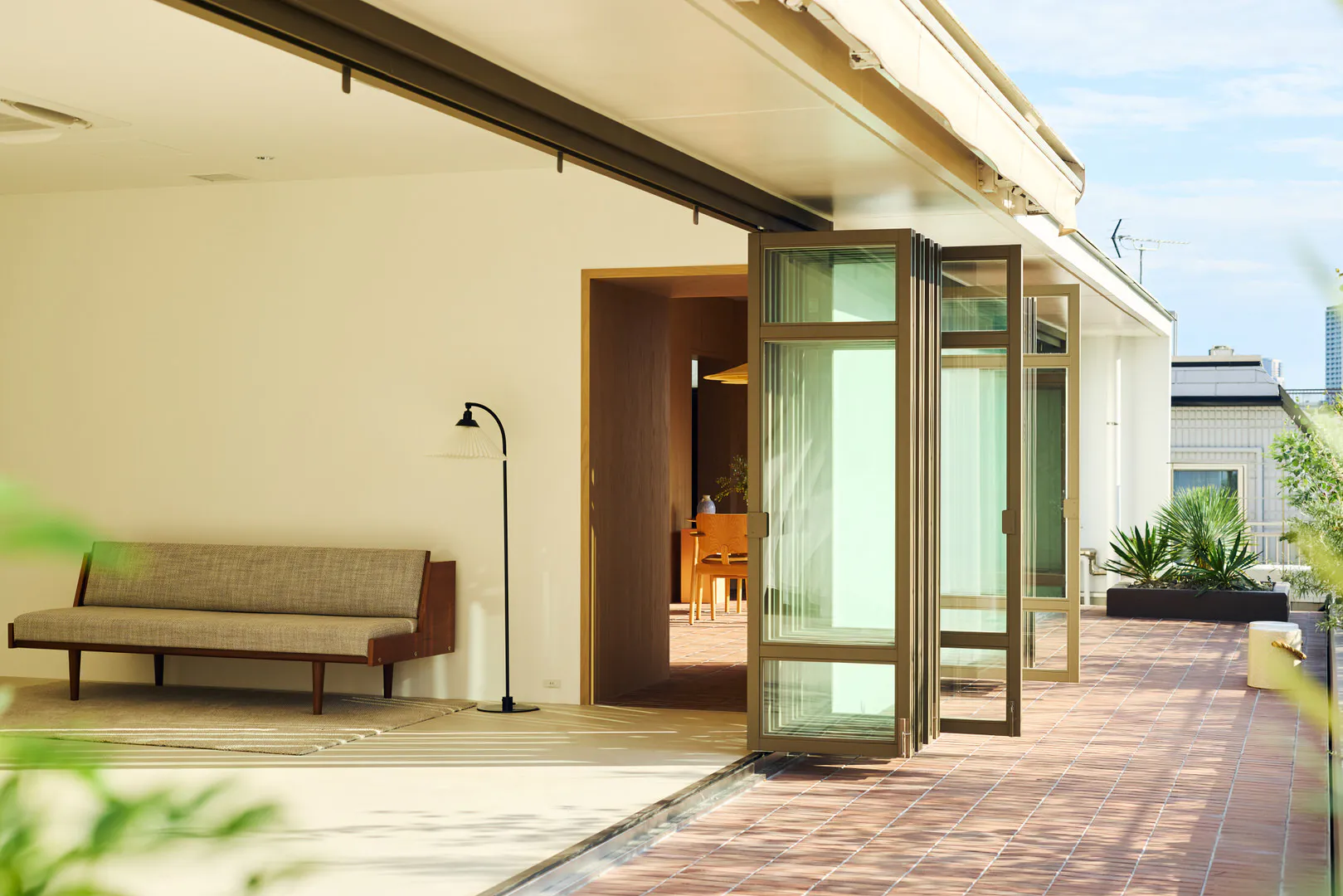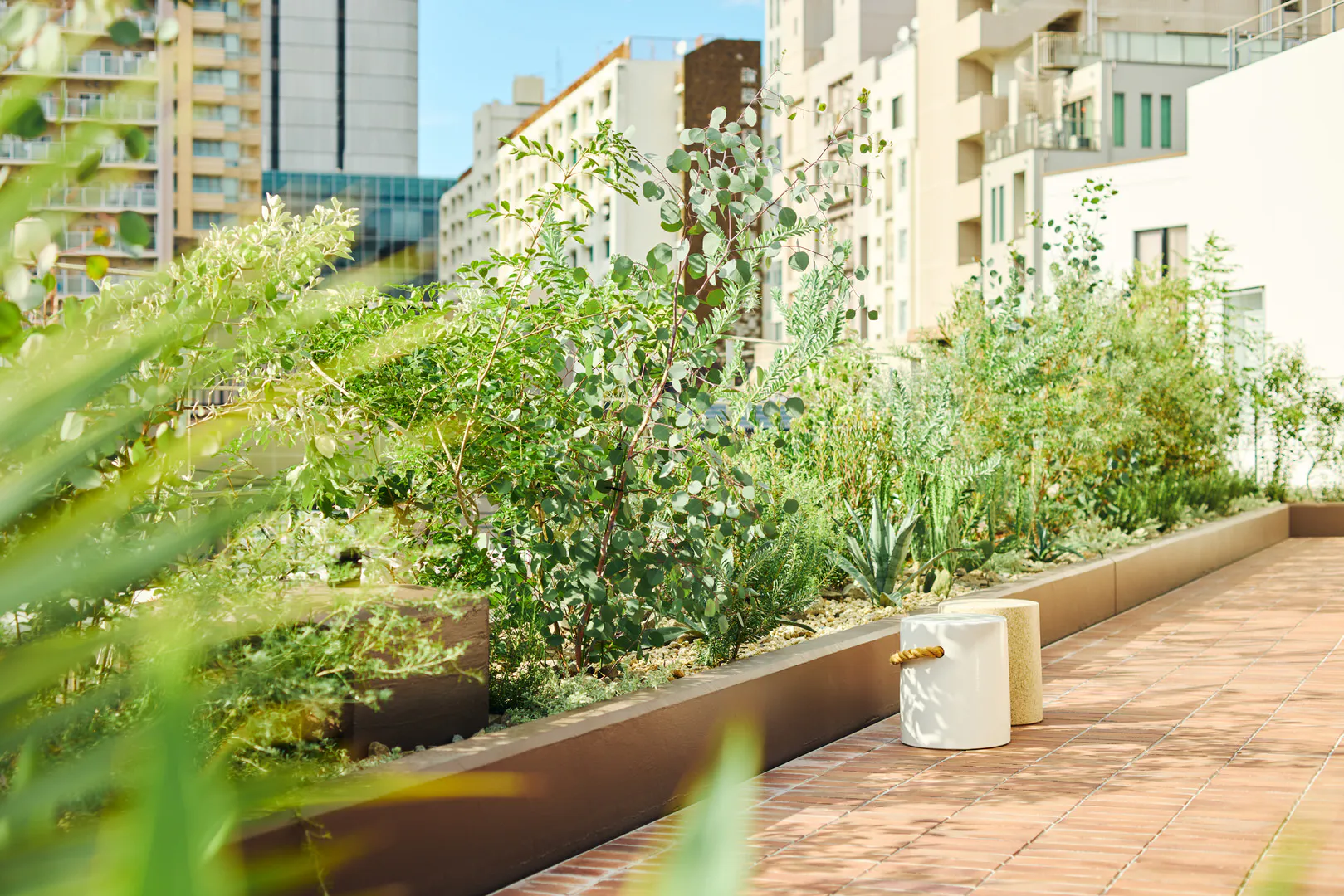 スタジオに入った瞬間に広がる緑豊かなルーフテラスは、空がひらけた開放的なビュー。遠景の街の緑とつながることで、背景に連続する奥行きを演出できます。