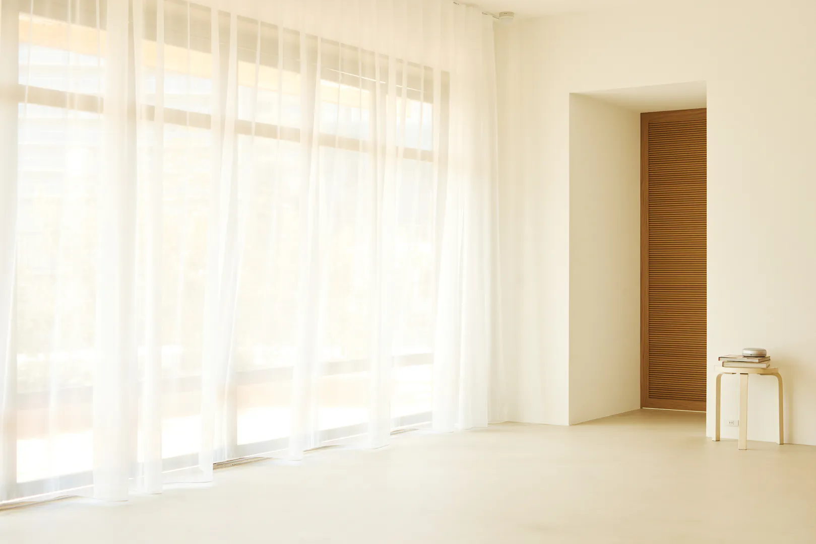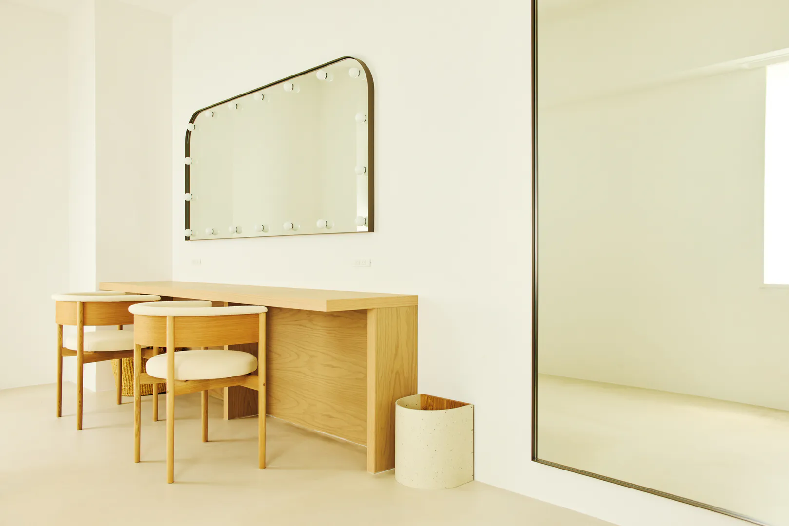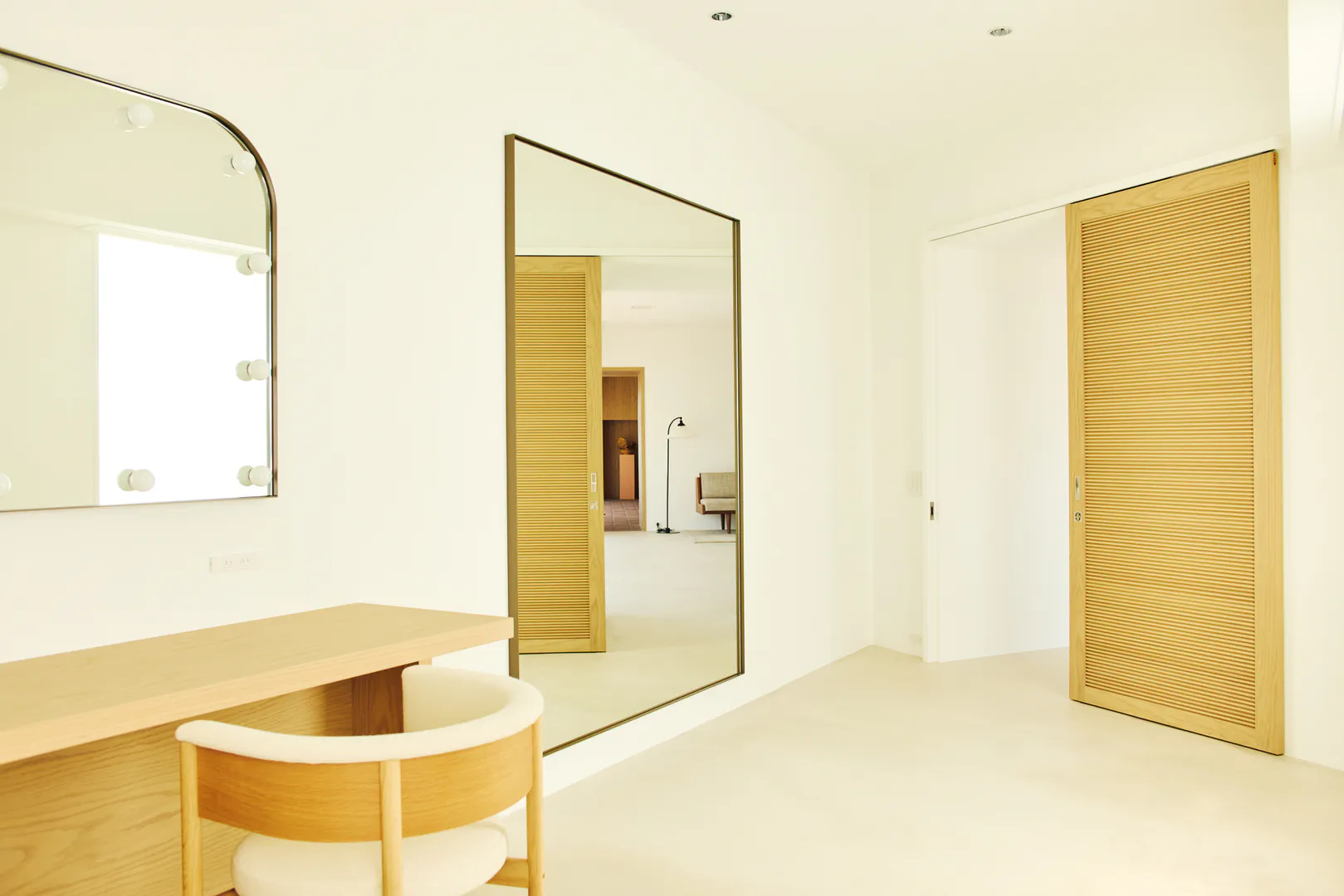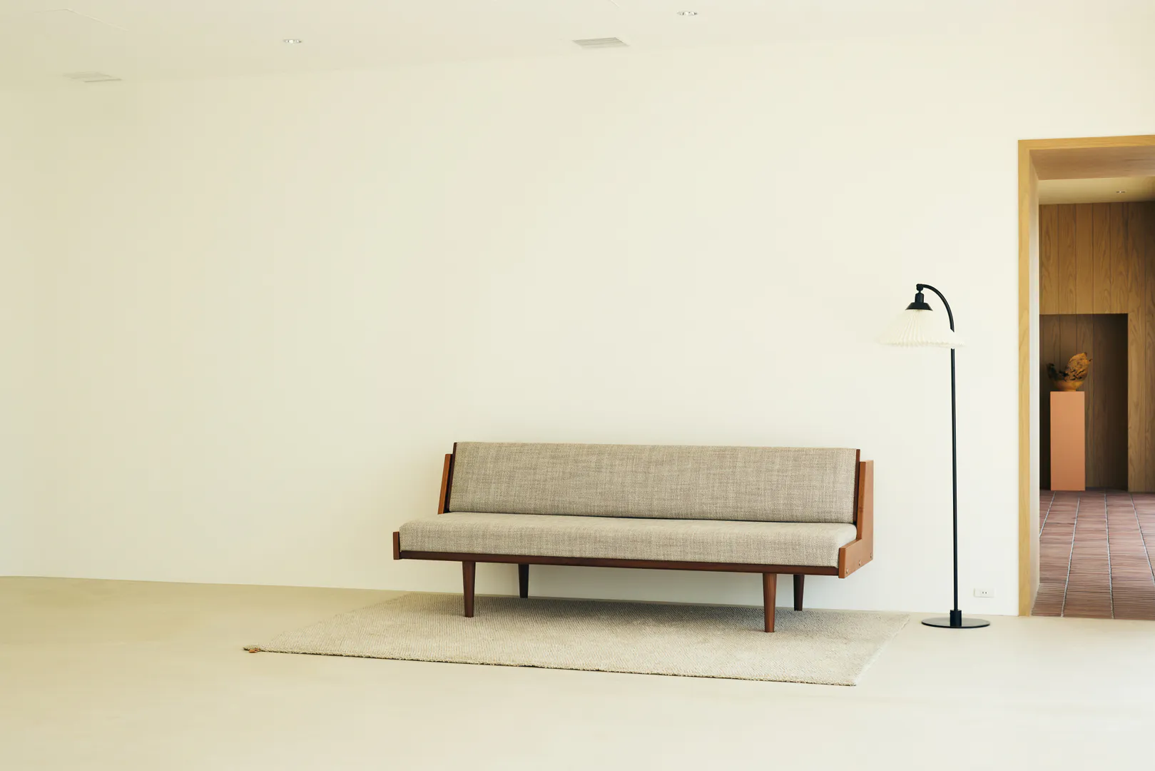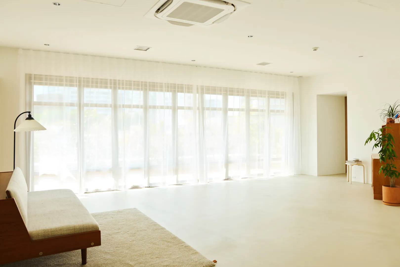 もう一つの空間は、白壁とモルタル調の床を基調にした明るく余白のある構成。アールの壁面が直線的な構造にやわらかさを添え、大きな開口と相まって、