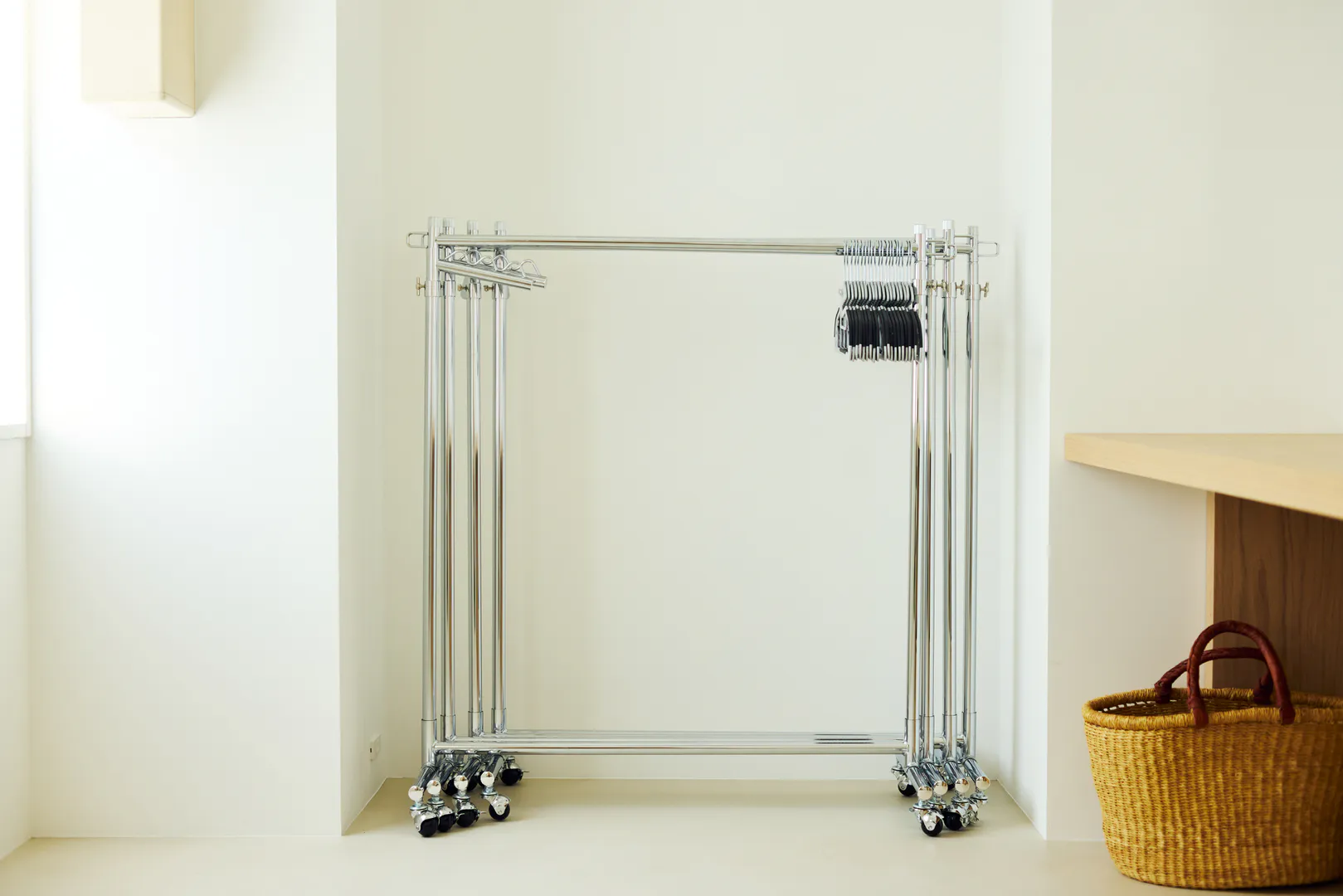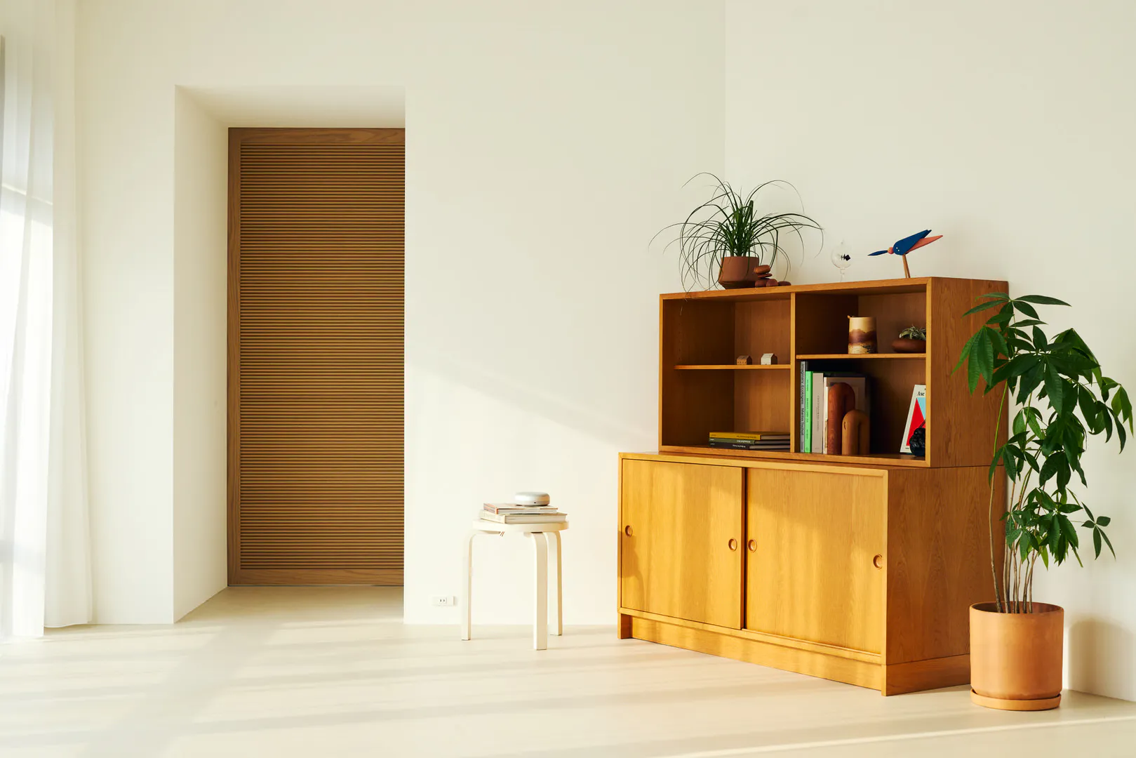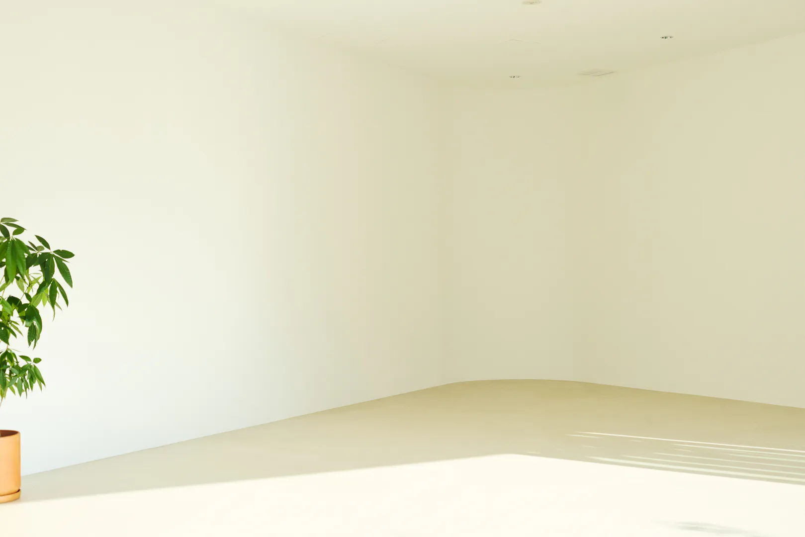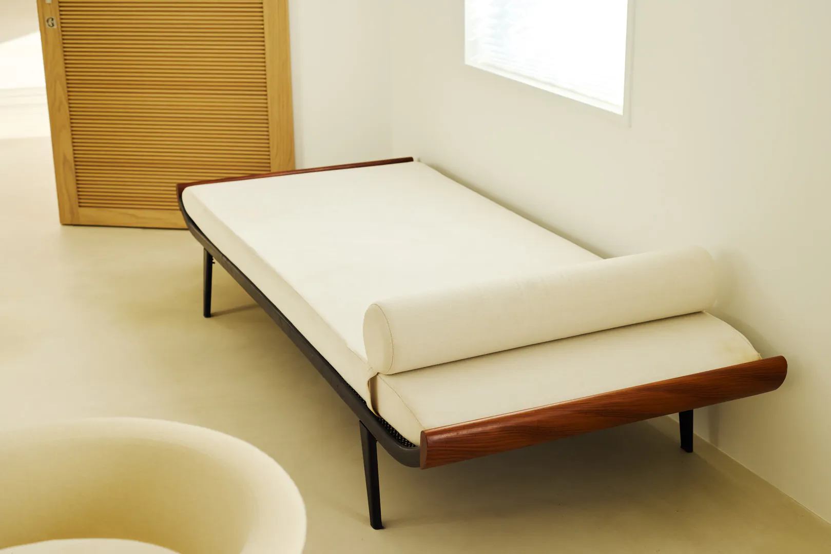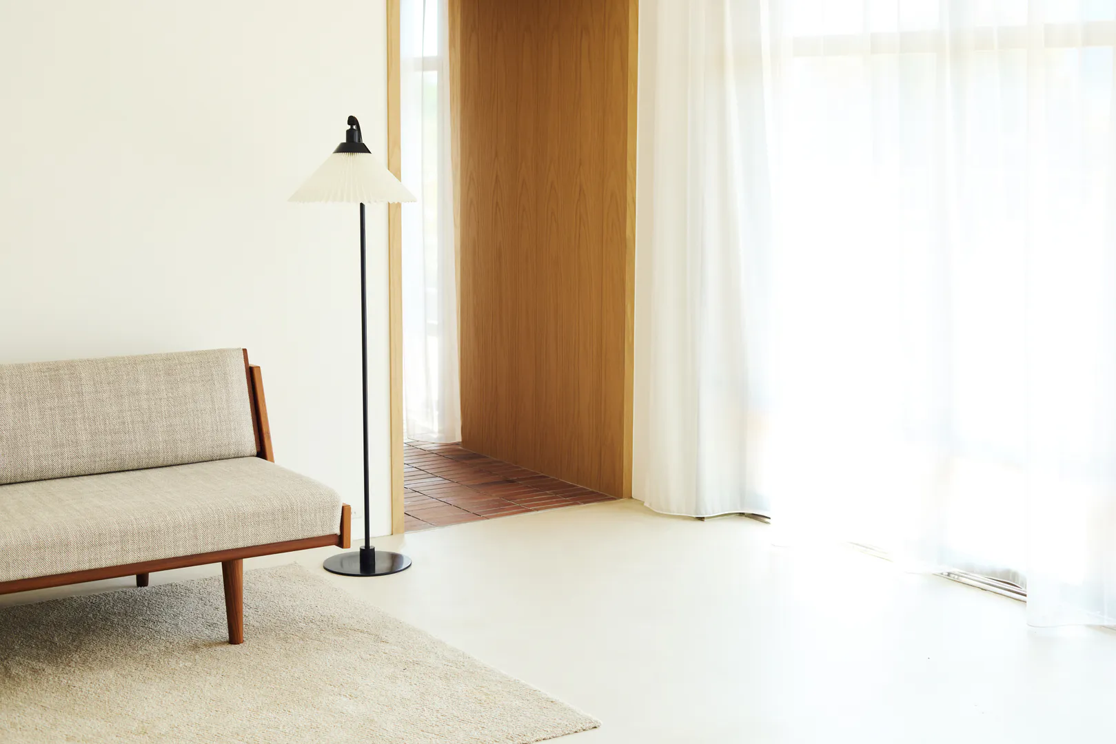 もう一つの空間は、白壁とモルタル調の床を基調にした明るく余白のある構成。アールの壁面が直線的な構造にやわらかさを添え、大きな開口と相まって、
